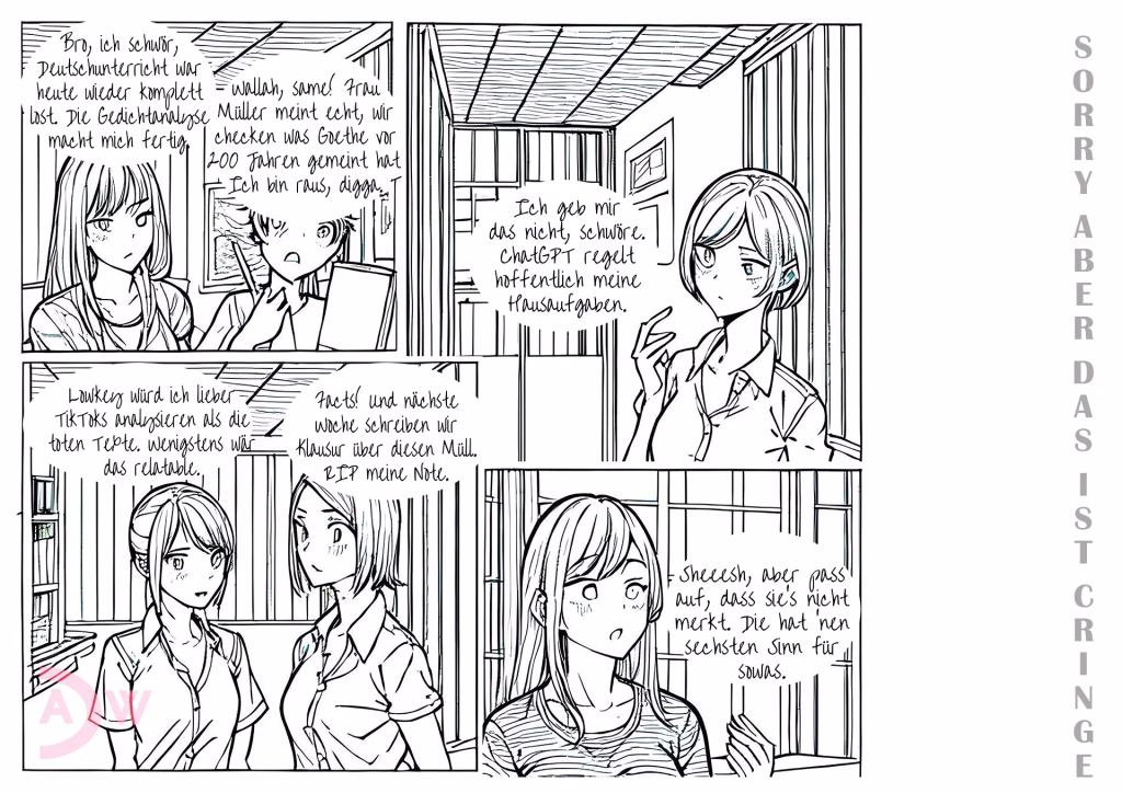 Technische Ausführung Die Schraffurtechniken an Wänden und Decken erzeugen räumliche Tiefe, während die bewusst minimalistisch gehaltenen Hintergründe den Fokus auf die emotionale Dynamik lenken. Die Verwendung von handgeschriebenen deutschen Texten verleiht dem Werk eine persönliche Note und durchbricht die Grenze zwischen kommerzieller Manga-Ästhetik und individueller künstlerischer Expression.