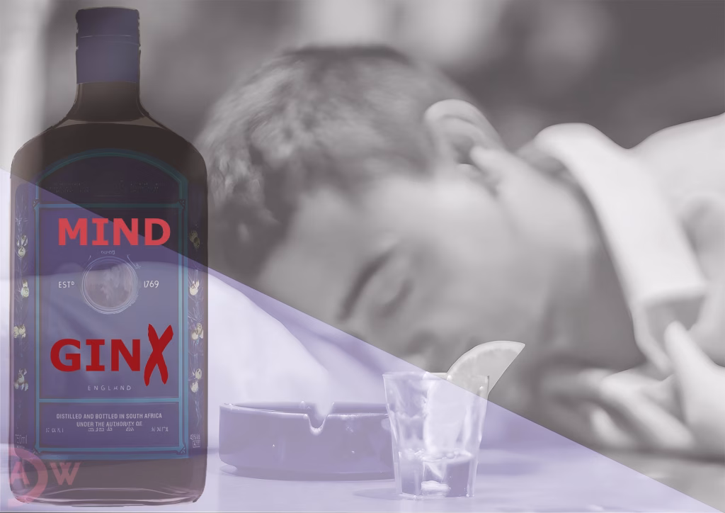 Der Titel „GinX/Jinx“ offenbart die konzeptuelle Raffinesse des Werks. „Jinx“ – ein Fluch oder Verhängnis – verschmilzt hier mit der Produktbezeichnung zu einer düsteren Prophezeiung. Die prominent platzierte Aufschrift „MIND“ auf dem Flaschenetikett verstärkt diese Lesart: Es geht um den Geist, der durch die Substanz sowohl befreit als auch gefangen wird.