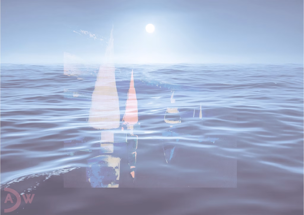 Diese digitale Komposition von Arslohgo mit dem vielschichtigen Titel „I Sea a Painting“ entfaltet sich als meditative Reflexion über die Durchlässigkeit zwischen Realität und Repräsentation. Der Künstler konstruiert einen Bildraum, der sich der eindeutigen Verortung entzieht – ein ozeanisches Environment, das gleichzeitig physisch und metaphorisch gelesen werden kann.