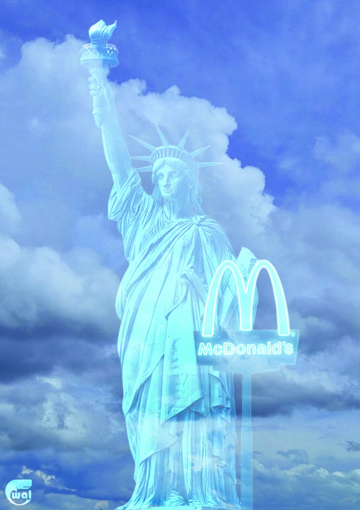 Die Integration des McDonald’s-Logos transformiert Bartholdis Monument in ein verstörendes Hybrid. Der goldene Bogen, strategisch am Sockel platziert, funktioniert wie ein Ownership-Stempel, eine Besitzmarkierung des globalen Fast-Food-Imperiums. Die Fackel der Aufklärung wird zur Leuchtreklame umcodiert – sie erhellt nicht mehr den Weg der Unterdrückten, sondern weist den Weg zum nächsten Drive-Through.