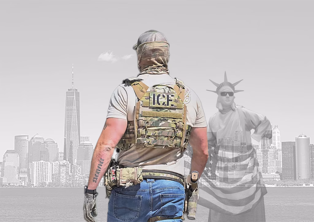 Die Freiheitsstatue als Straßenkünstler – das ist Amerika im Zeitalter von ICE: Die Freiheit selbst muss sich prostituieren, um zu überleben, während bewaffnete Agenten das Straßenbild dominieren.