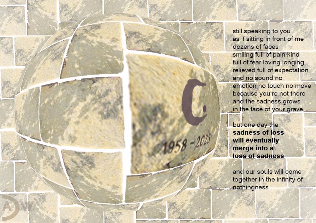 Die zerbrochene ovale Form, die C.s Initialen und Lebensdaten (1958-2023) trägt, fungiert als visueller Nukleus einer auseinanderdriftenden Welt. Diese Fragmentierung operiert auf mehreren Bedeutungsebenen: Sie visualisiert sowohl den Moment des Bruchs – den unwiderruflichen Einschnitt, den der Tod in die Kontinuität des gemeinsamen Lebens reißt – als auch die fortdauernde Desintegration der zurückbleibenden Identität. Die Risse durchziehen nicht nur den Stein, sondern kartographieren die Topologie einer zerbrochenen Subjektivität.