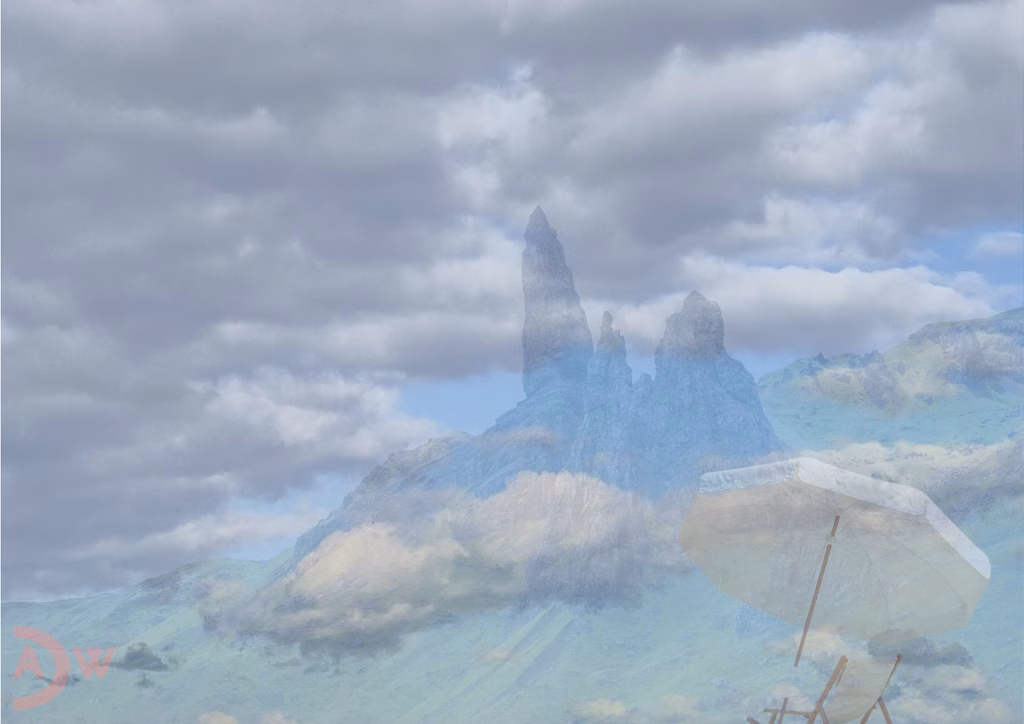 Die titelgebende Verschmelzung von „Sky“ und „Isle“ manifestiert sich hier nicht als poetische Metapher, sondern als bildnerisches Programm. Die Isle of Skye – jener mythisch aufgeladene Sehnsuchtsort der schottischen Highlands – wird nicht dokumentiert, sondern dekonstruiert. Wo man monumentale Felsformationen wie den Old Man of Storr erwarten würde, bietet das Werk eine nahezu impressionistische Auflösung: Gesteinsformationen lösen sich in atmosphärische Schleier auf, werden zu Silhouetten im Nebel, zu bloßen Andeutungen ihrer geologischen Präsenz.