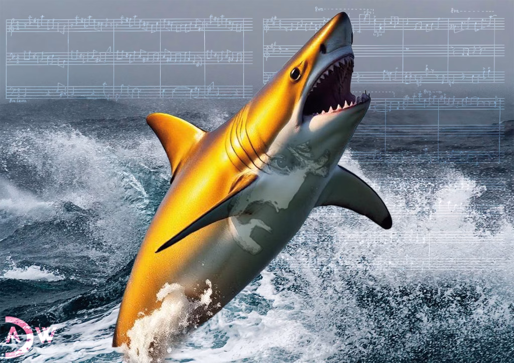 Die technische Ausführung zeigt hohe digitale Handwerkskunst. Die fotorealistische Darstellung des Hais kontrastiert effektvoll mit der abstrakten Notation, während die CMYK-Farbgebung dem Werk eine leicht artifizielle, fast poster-artige Qualität verleiht, die an Konzertplakate der 1970er und 80er Jahre erinnert.