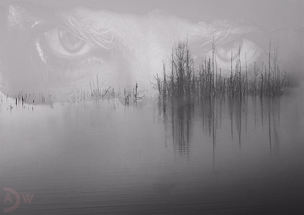 Die Doppelbelichtungstechnik verschmilzt auf meisterhafte Weise ein übergroßes, wachsames Auge mit einer trostlosen Sumpflandschaft. Diese Überlagerung erzeugt eine vielschichtige Bedeutungsebene: Das Auge wird zur allgegenwärtigen, beobachtenden Instanz, während die kahlen Baumstämme wie Wimpern oder Nervenbahnen aus der Iris hervorwachsen. Die gespiegelte Wasseroberfläche verstärkt die surreale Qualität und schafft eine traumartige Symmetrie, die zwischen Realität und Reflexion oszilliert.