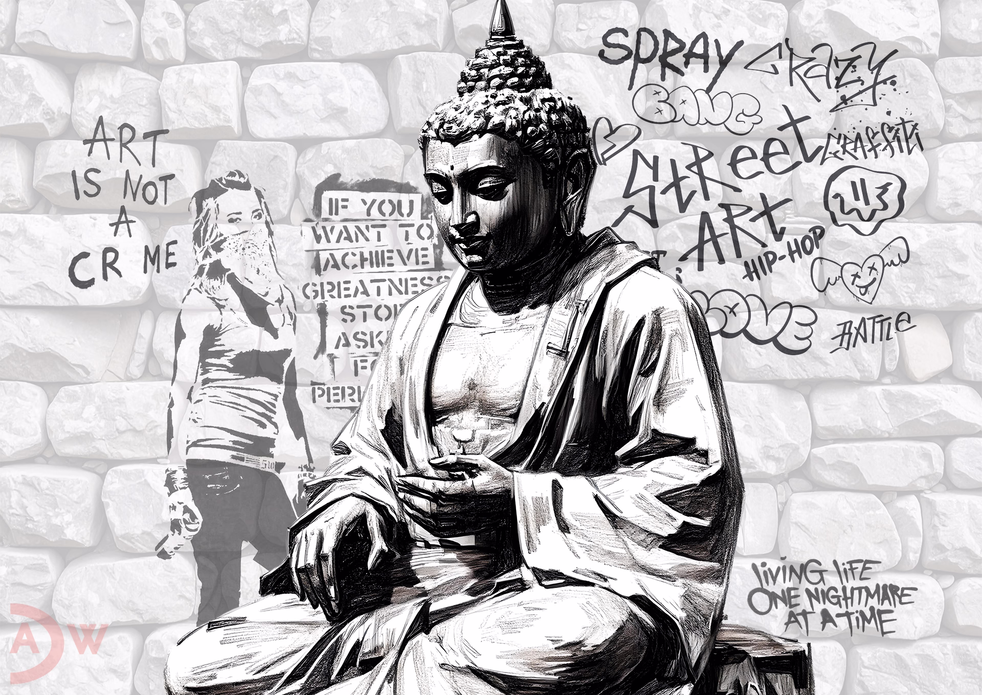Sowohl die Bodhisattva-Figur als auch die Wand wurden mittels generativer KI erschaffen. Die Graffiti zeigen bekannte Phrasen, die aus dem gesamten Internet stammen.