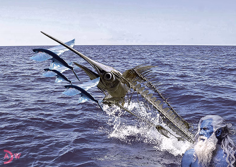 Hemingway – Die meisten Menschen kennen Hemingways Namen, und viele sind mit „Der alte Mann und das Meer“ vertraut, selbst wenn sie den Autor nicht zuordnen können. Dieses Werk zeigt Santiago in den Momenten, bevor er nach drei Tagen und Nächten des einsamen Kampfes mit einem Marlin in sein kleines kubanisches Küstendorf zurückkehrt. Da Haie den Marlin während seiner Rückfahrt verschlangen, bringt Santiago nur dessen Skelett mit. In diesem Bild hat er jedoch wenigstens die Gesellschaft fliegender Fische.