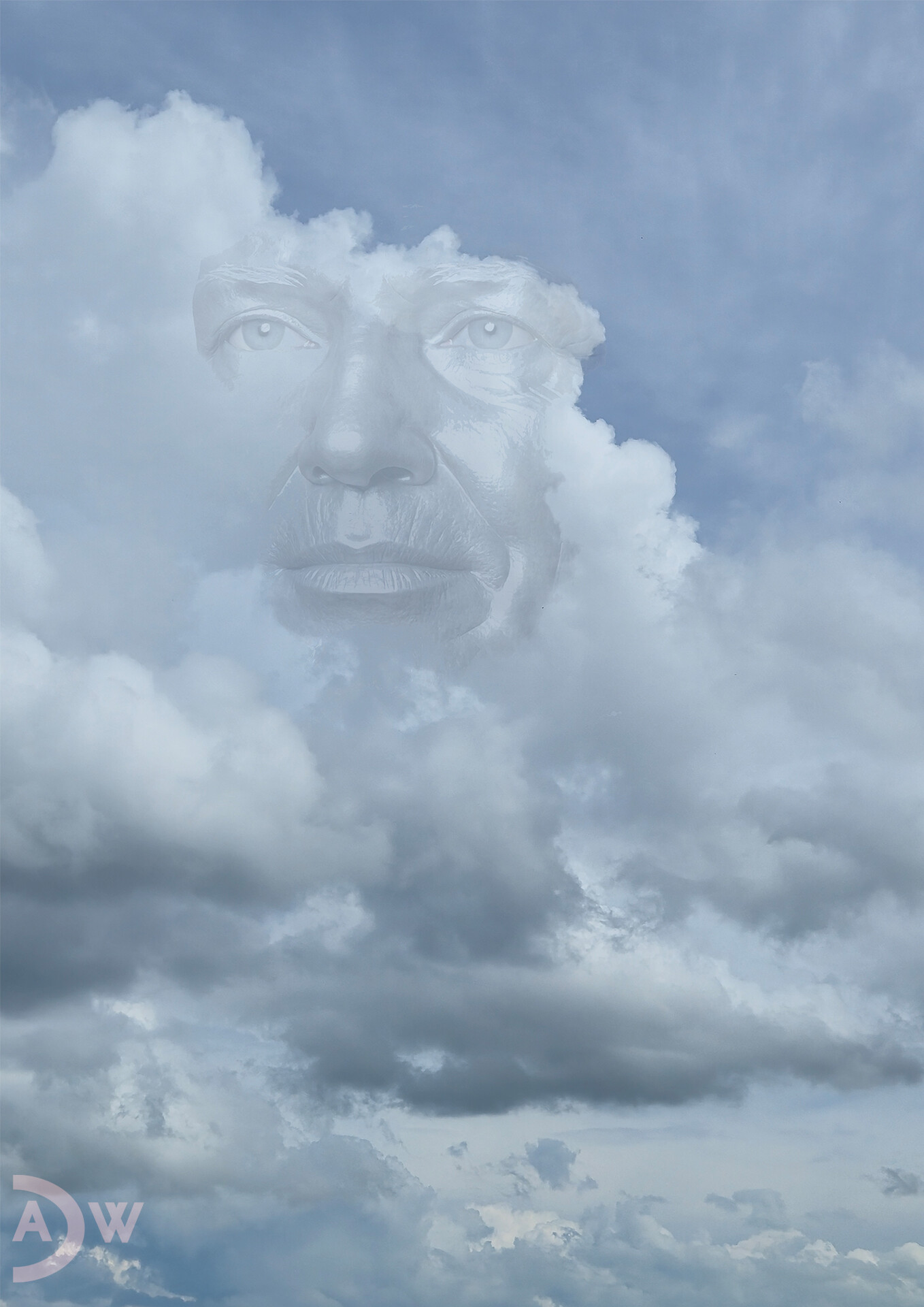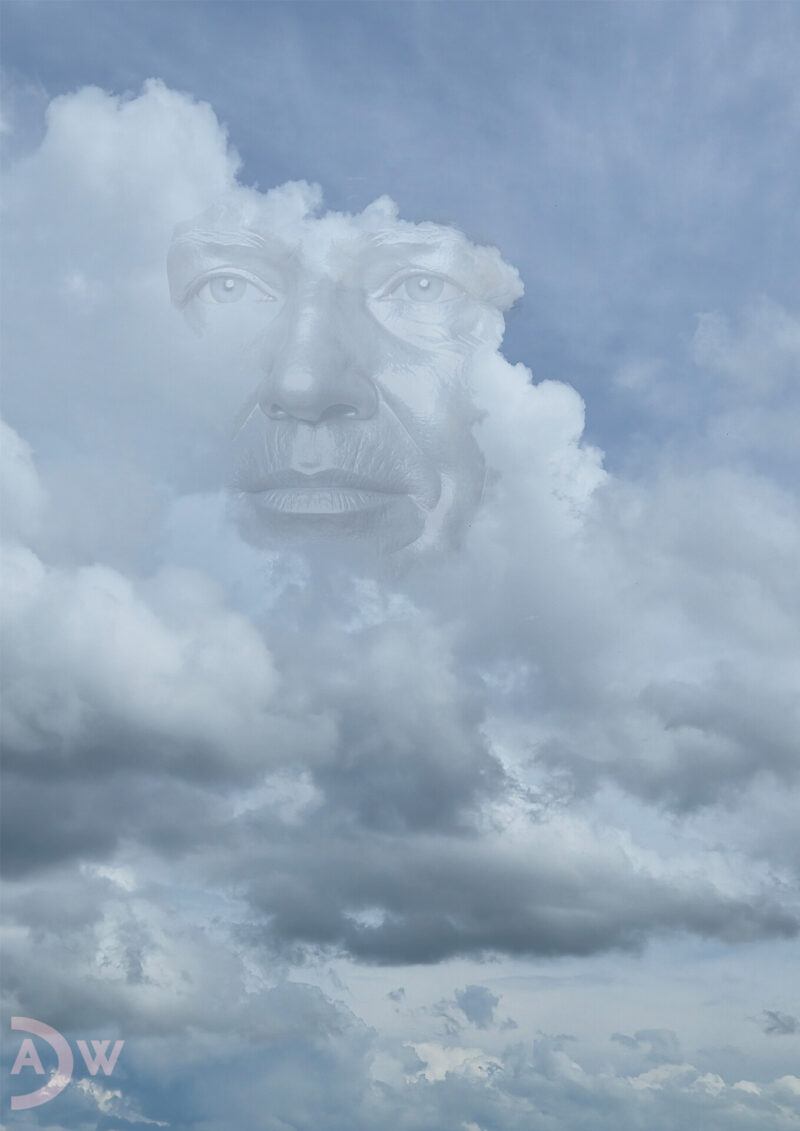 „It’s Only Clouds“ ist eines meiner ersten „Experimente“, einer meiner ersten Versuche, generative KI zur Werkgestaltung einzusetzen. Das männliche Gesicht entstand durch diesen Prozess und wurde anschließend weiter bearbeitet und in die Wolkenfotografie integriert (Himmel über Dinard, Bretagne).