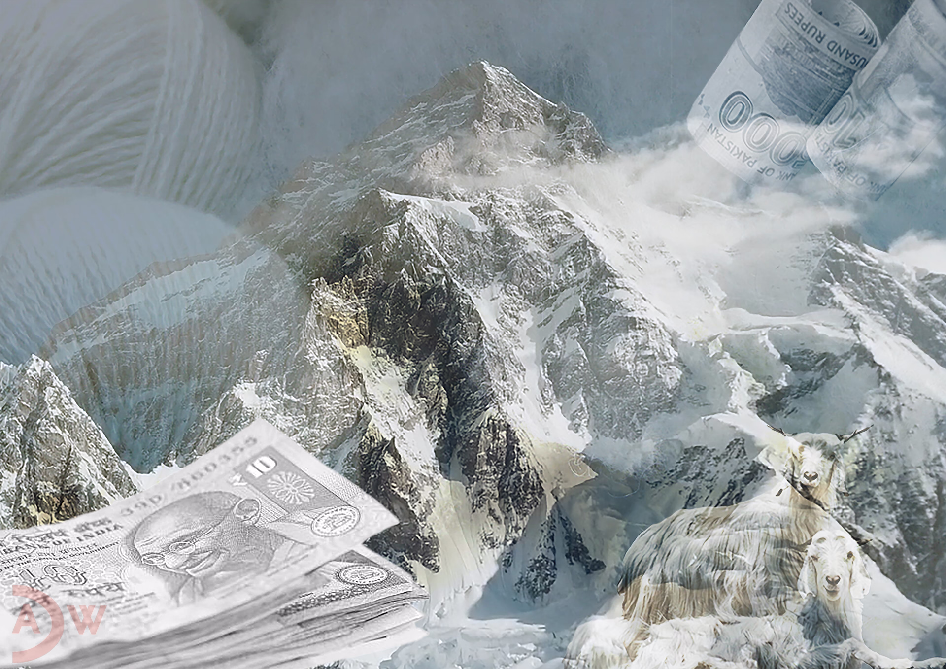 „Kashmere“ ist ein Konstrukt aus ‚Kashmir‘ (dem Namen einer ethnisch vielfältigen Himalaya-Region) und ‚cashmere‘ (feiner Wolle aus dem Fell der Kaschmirziege, einem der teuersten Produkte der Welt). Die neue Wortkombination der beiden gleich ausgesprochenen Begriffe begleitet ideal mehrere Themen, die in der Bildkomposition miteinander verwoben sind: die schroffe Berglandschaft des Himalayas als ursprünglicher Lebensraum der Kaschmirziegen, eingebettet in Knäuel aus Kaschmirwolle und unverarbeiteter Kaschmirwolle, die im Deutschen wortwörtlich ‚blankes Geld‘ ergibt – wobei die beiden Silben des Wollbegriffs vertauscht werden.