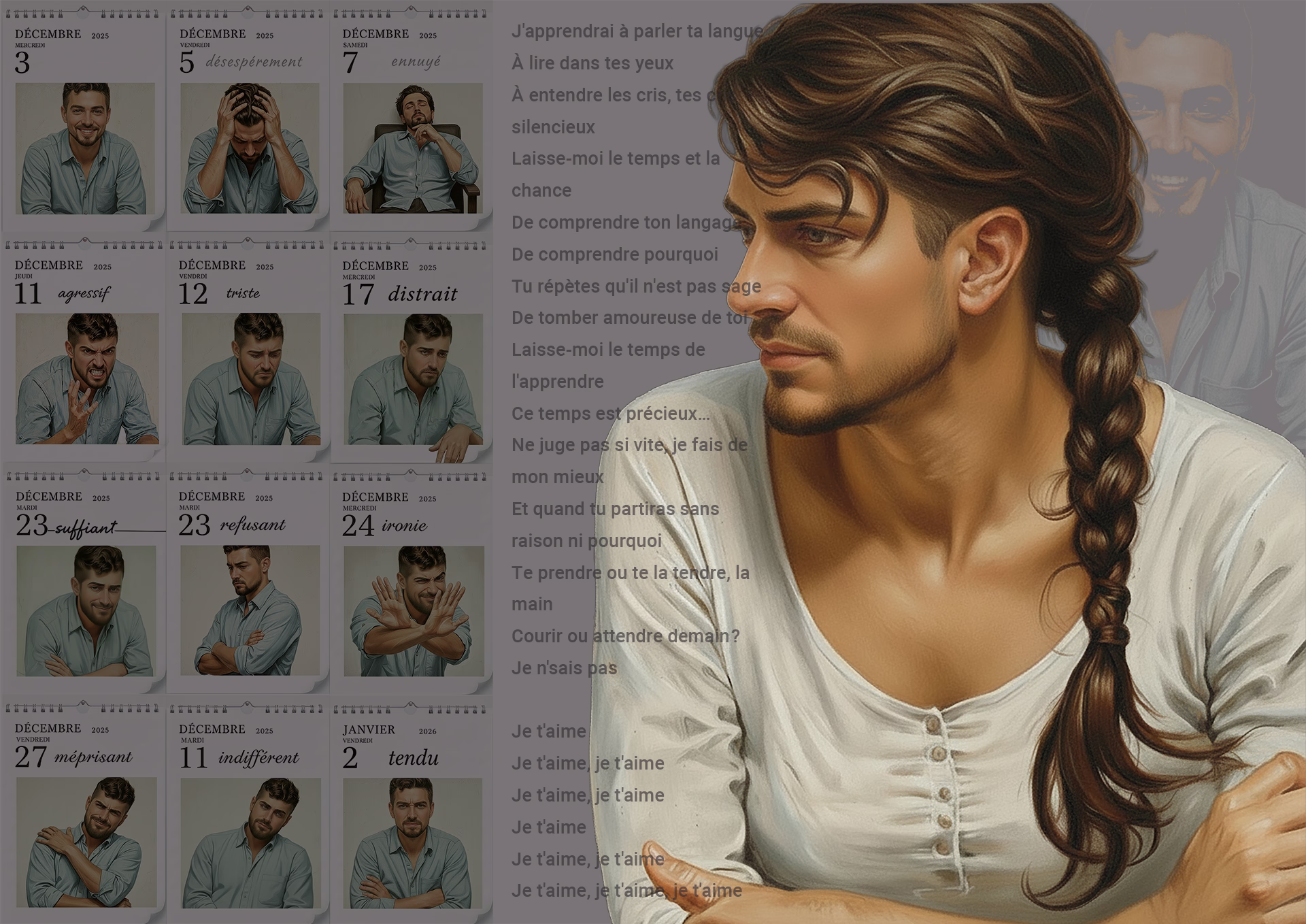 „Langage (saussurelment) ist der Versuch, dieses Lied in Bildsprache zu transformieren. Zugrunde liegt ein Photo von einer Kommunikationsituation eines Paares in einer Hetero-Beziehung. Die Situation wurde aufgelöst, die Protagonisten wurden isoliert, als in der Darstellung verfremdet und die Hetero-Beziehung „modernisiert“. Sie/Er lässt einige Tage Revue passieren und Bilder von ihm vor ihrem geistigen Auge wieder erscheinen. Sie/Er ruft in ihrem Kopf einen inneren Kalender ab, in dem sie/er zu Daten und Bildern emotionale Anmerkungen gemacht hat.