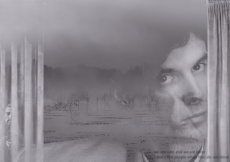 Unsere Psyche gleicht einem nebligen Sumpf, der sich hinter geschlossenen Vorhängen verbirgt. Sie ist düster und unbequem, und wenn sie hervortritt, wirkt es, als hätten sich die Vorhänge zu einer anderen Welt geöffnet. Genau das greift „Psycho Drapes“ auf – inspiriert von „Psycho Killer“. Als Erstes fallen die Moorlandschaften in der Bildmitte auf und das aus dem Dunst auftauchende Gesicht des jungen David Byrne. Bei genauerem Hinsehen erkennt man, dass in der unteren Gesichtshälfte ein weiteres Gesicht hervortritt – das des Altmeisters der Tiefenpsychologie, Sigmund Freud. Dieser Name/dieses Bild kommt einem unweigerlich in den Sinn, wenn der Begriff „Psycho“ fällt. Die Vorhänge rechts sind nicht vollständig geöffnet, manches bleibt noch verborgen. Hinter den Vorhängen links, die ebenfalls nur teilweise geöffnet, aber teils durchsichtig sind, ist auch ARSlohgo im Bild; schließlich entstand es in seinem Kopf. Er beobachtet diese Psycho-Szene auf seinem Smartphone. Allerdings vermittelt dieses Bilddetail eher den Eindruck, hinter Gittern gefangen zu sein – eingesperrt in der eigenen Psyche – mit dem Hilferuf: „Holt mich hier raus“ … Die Textphrase in der rechten unteren Ecke besteht aus zwei Zeilen aus „Psycho Killer“, wobei ich die zweite Zeile auf meine eigene Weise umformuliert habe.
