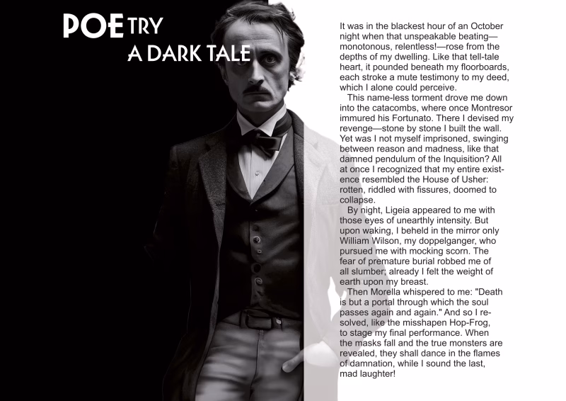 Der Titel dieses „Bildtextes“ kann auf zwei Arten gelesen werden. Einerseits als „POEtry: A Dark Tale“ und andererseits als „POE: Try A Dark Tale“; in beiden Fällen mit einem deutlichen Fokus auf Poe.