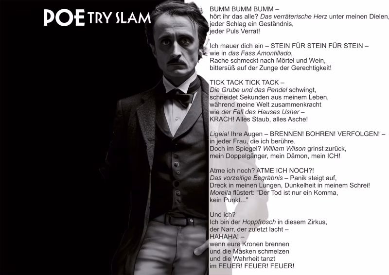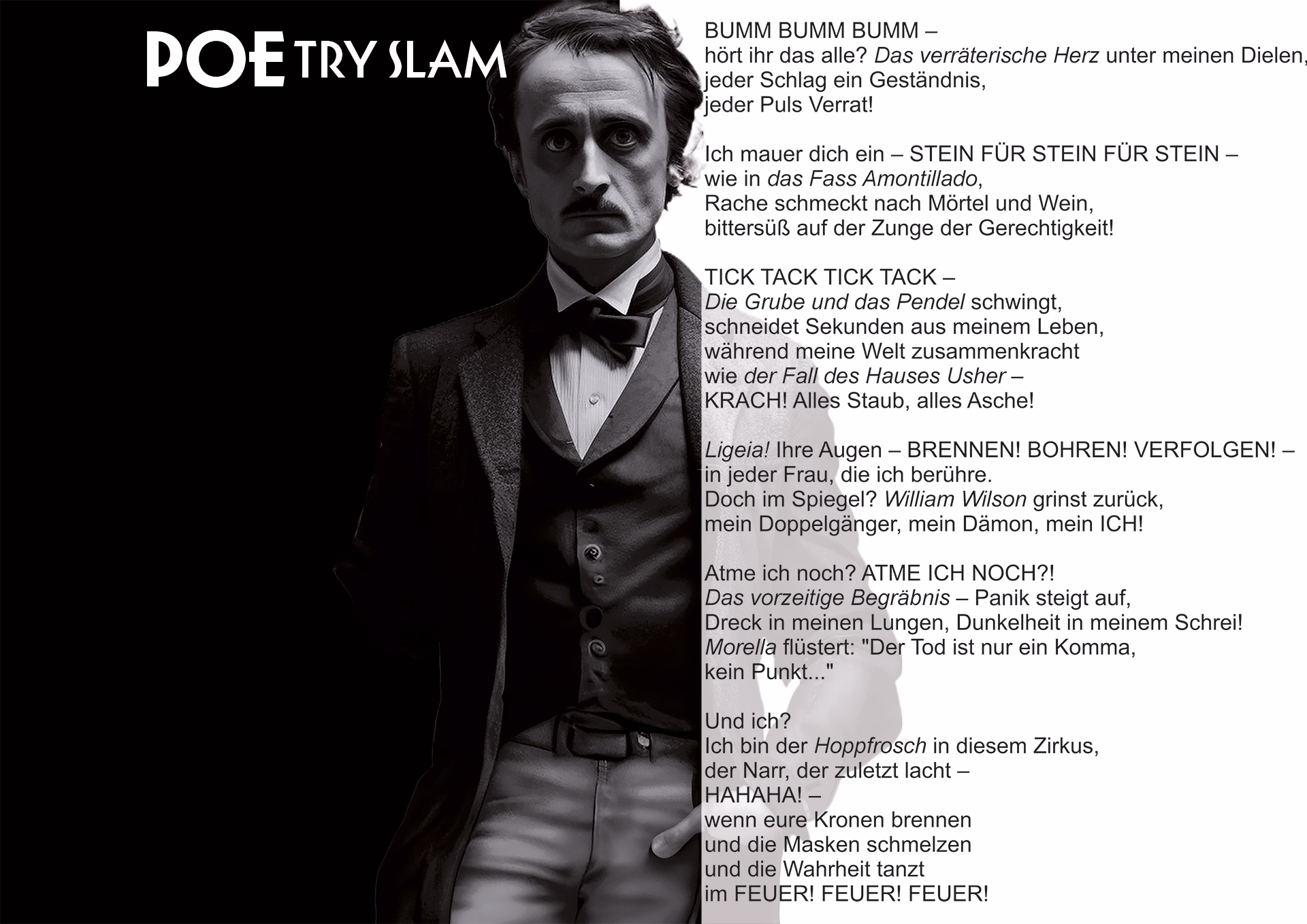 Wie „POE sie eine düstere Geschichte“ sind auch hier die folgenden neun Poe-Geschichten Ausgangspunkt für „POEtry Slam“: Das verräterische Herz, Das Fass Amontillado, Die Grube und das Pendel, Der Untergang des Hauses Usher, Ligeia, William Wilson, Die vorzeitige Grablegung, Morella und Hoppfrosch. Ziel war es, Poes Elemente in einem modernen Stil einzufangen und Poe in Form von performativer Poesie in die Gegenwart zu holen. Performance-Elemente (Onomatopoesie, Wiederholungen, dramatische Betonungen) werden in Großbuchstaben dargestellt, die zugrundeliegenden Titel in Kursivschrift.