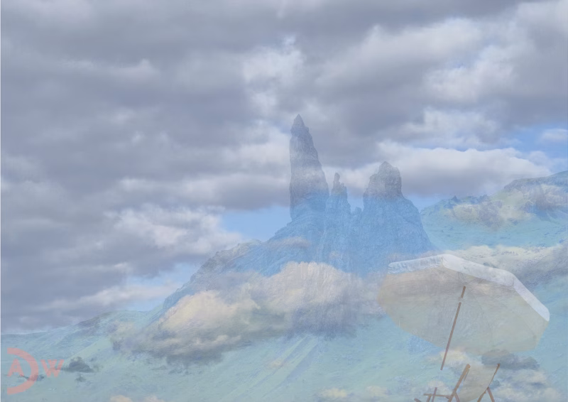 „SKISLE“ – eine Verschmelzung von „sky“ und „isle“, ausgesprochen [skˈa͡ɪə͡l], zeigt einen Blick auf Schottlands Isle of Skye auf den Hebriden. Ich schuf dieses Werk in der Bretagne, inspiriert von Urlaubserinnerungen nach Wanderungen entlang der Klippen und Rückbesinnung auf vergangene Reisen.