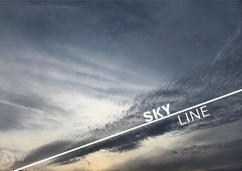 „SKYline“ zeigt einen Himmelsausschnitt, durchkreuzt von einer diagonalen Linie – offensichtlich eine Himmelslinie. Zugleich bezeichnet der Begriff ‚Skyline‘ weltweit das Panorama einer Stadt mit ihren höchsten Gebäuden vor dem Horizont. Auch wenn es in der Natur keine wirklich geraden Linien gibt, sondern nur Krümmungen und Biegungen, nehmen wir gerade Linien wahr oder stellen sie uns vor. Und selbst wenn sie nicht existieren, können sie zumindest „künstlich“ eingefügt werden. Die Kunst eröffnet uns die Möglichkeit, Unmöglichkeiten zu Wirklichkeiten hinzuzufügen – zu welchem Zweck auch immer. In diesem Fall, um eine sprachliche Mehrdeutigkeit zu erzielen.