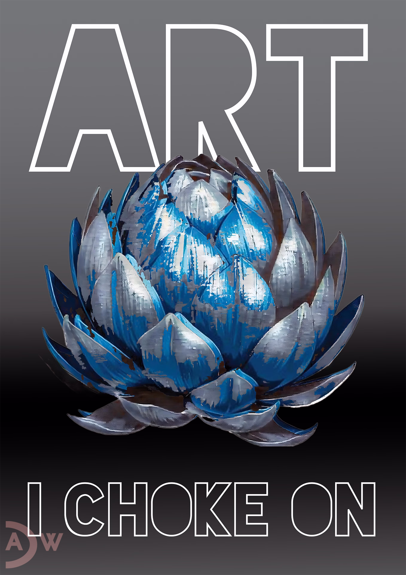 Wenn wir ein Bild einer Artischocke sehen oder eine in natura vor uns haben, denken wir sofort an das Wort „Artischocke“. Hören oder sehen wir den Begriff „Artischocke“, haben wir gleichzeitig ein Bild der Pflanze vor unserem geistigen Auge. Je nach unserem Vorwissen und unserer Erfahrung wird zudem klar, dass es sich um eine große essbare Blütenknospe handelt, genauer gesagt um den noch geschlossenen Blütenstand einer distelartigen Pflanze. In diesem Poster steht die Artischocke im Mittelpunkt – zwar als künstlerisch dargestellte Blütenknospe, aber primär als Stellvertreterin für die kontrastierenden Interpretationen, die sich aus ihrem Namen ergeben, beziehungsweise aus dem um eine kleine Präposition erweiterten Namen. Betrachten Sie das Wort „artichoke“ genauer und zerlegen Sie es in seine Bestandteile: das Substantiv „art“, das Personalpronomen „I“, das Verb „choke“, und fügen Sie dem Verb die Präposition „on“ hinzu – so erhalten Sie die bedeutungsvolle Phrase „art I choke on“. „Art“ fungiert als Blickfang und Thema oberhalb der Artischocken-Abbildung, während „I choke on“ unterhalb der Artischocke als Aussage über das Thema wirkt. Das Ergebnis ist ein minimalistisches Poster aus drei Elementen und einer dichotomen Trennung zwischen positiver und negativer Interpretation der Aussage.