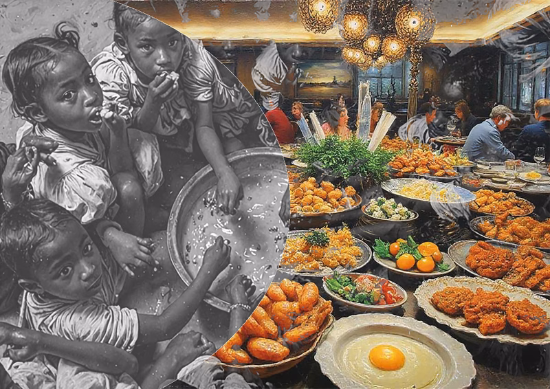 Ein Beispiel für extensive Lebensmittelverschwendung (und unsere Dekadenz): „All You Can Eat“-Buffets. Hier landen schätzungsweise 20 Prozent der Speisen auf dem Müll. Etwa ein Drittel der Menschheit ist von Ernährungsunsicherheit betroffen, 300 Millionen Menschen leiden akut an Hunger und weltweit werden täglich eine Milliarde Mahlzeiten, etwa ein Fünftel aller Lebensmittel, weggeworfen. Nicht auf den ersten Blick ersichtlich, doch lassen sich Parallelen zu „Tribute von Panem“ (The Hunger Games im Original) ziehen …