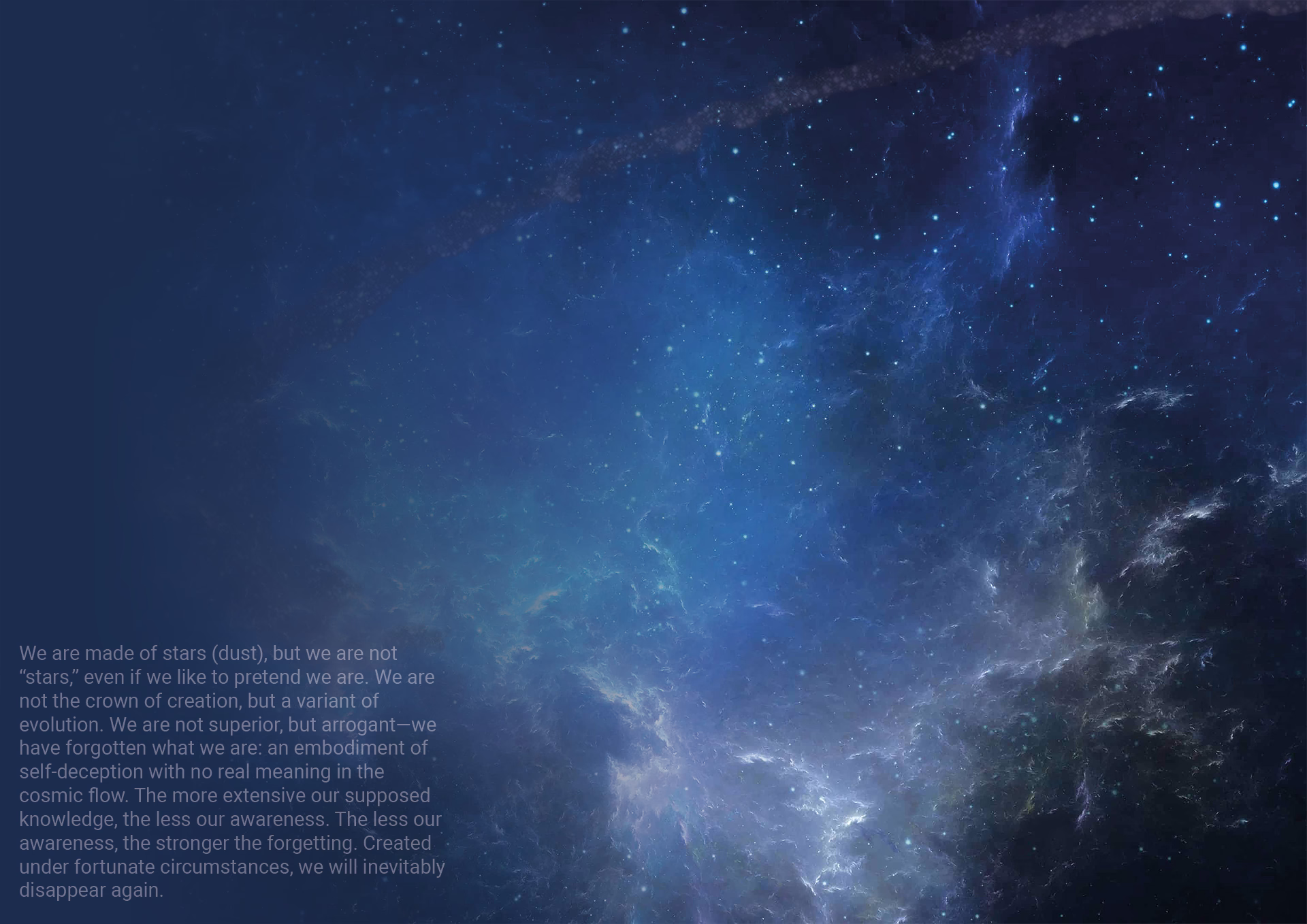 Wir sind aus Sternen(staub) gemacht, doch wir sind keine „Stars“, auch wenn wir uns gerne einbilden, welche zu sein. Wir sind nicht die Krone der Schöpfung, sondern eine Variante der Evolution. Wir sind nicht überlegen, sondern arrogant – wir haben vergessen, was wir sind: eine Verkörperung der Selbsttäuschung ohne wirkliche Bedeutung im kosmischen Fluss. Je umfassender unser vermeintliches Wissen, desto geringer unser Bewusstsein. Je geringer unser Bewusstsein, desto stärker das Vergessen. Unter glücklichen Umständen entstanden, werden wir unweigerlich wieder verschwinden.