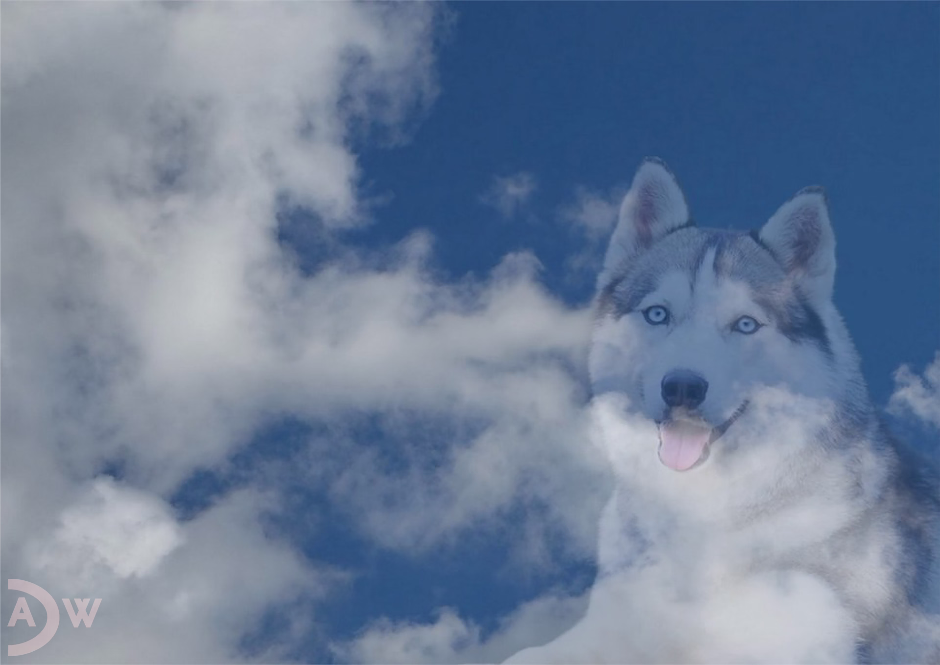 Ein Blick auf den Himmel und ein Siberian Husky, der aus den Wolken hervorlugt – hier verschmelzen die Wörter „sky“ und „Siberian Husky“ zum Wort-Bild-Spiel „YKS UH NAIRIBYKS“. Von rechts nach links gelesen beginnt die ‚Klartext‘-Bildunterschrift mit dem Himmel und endet mit dem Himmel.